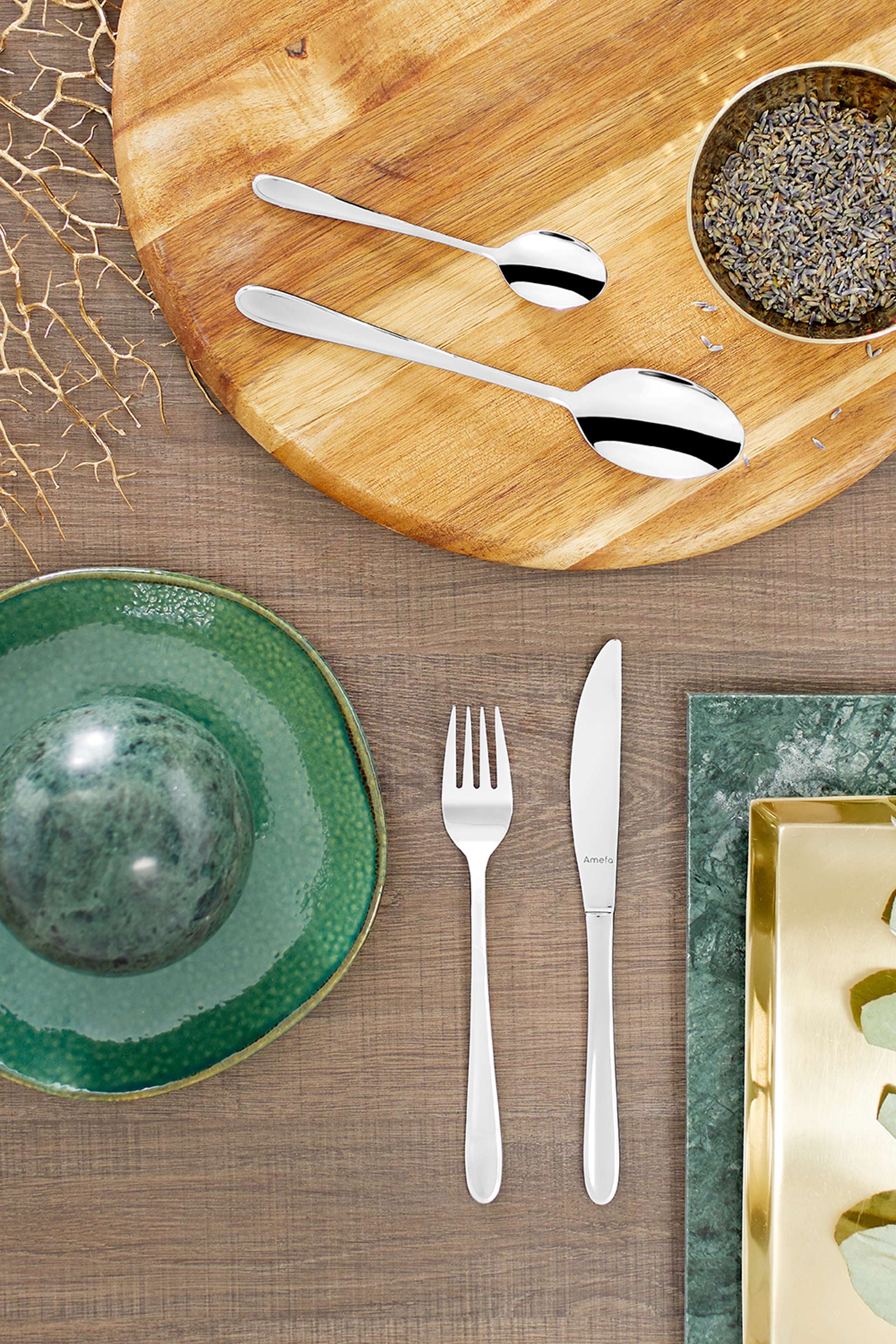 Monaco bestek heeft een tijdloos ontwerp met zachte, organische lijnen en opstaande randen.