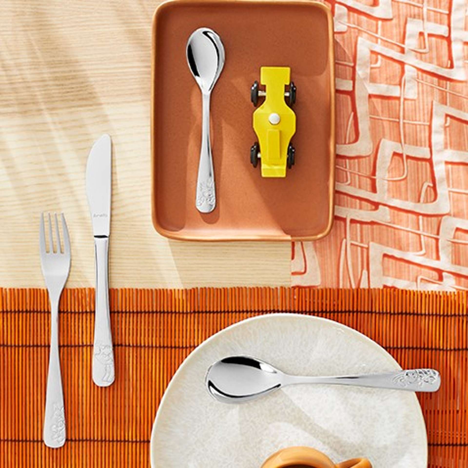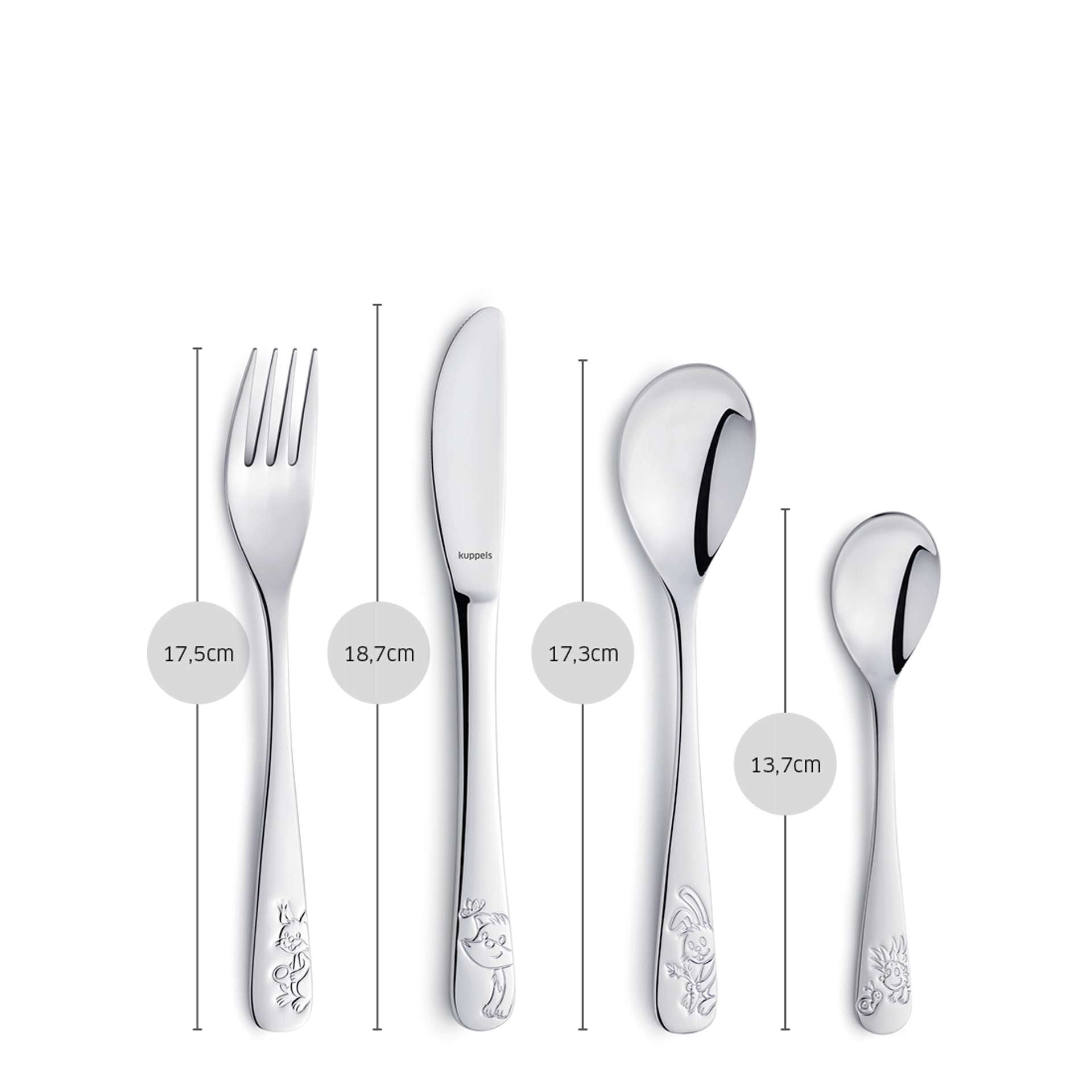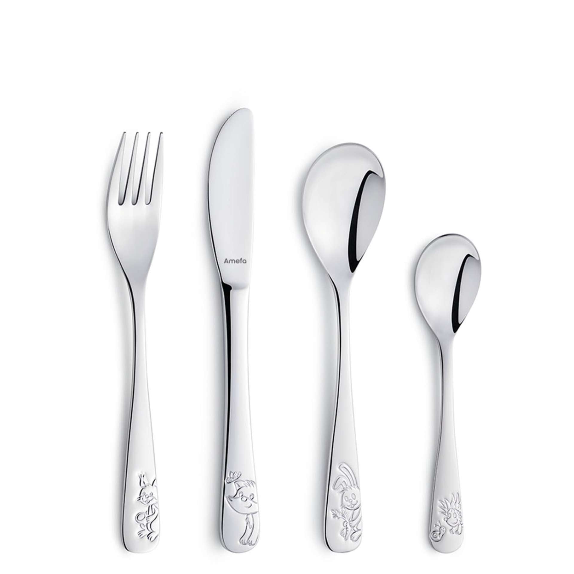 De vos, eekhoorn, konijn en egel zijn de bosvrienden van je kleintje. Met hun beeltenissen op de handvaten is elke maaltijd een waar feestmaal.