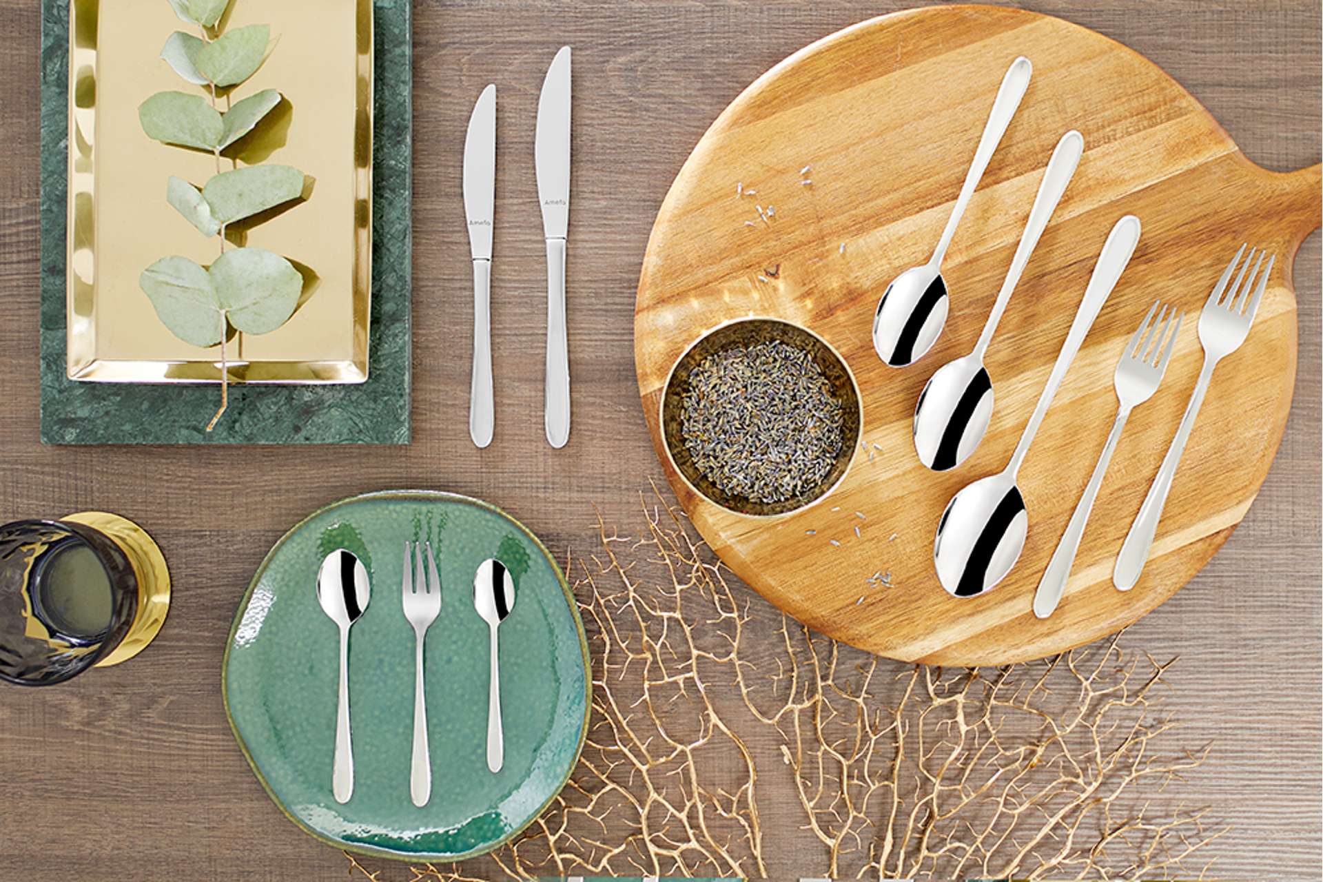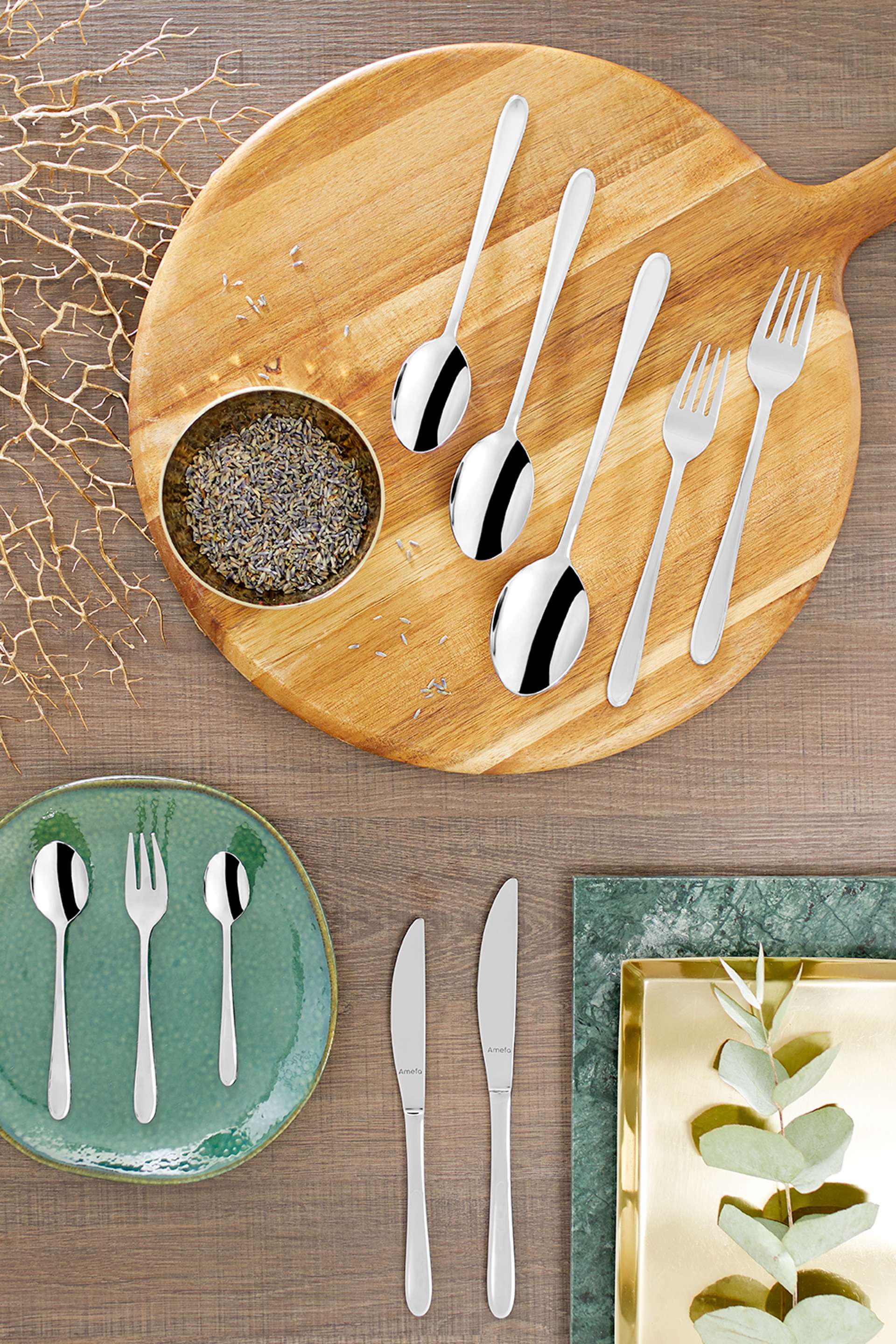 Monaco bestek heeft een tijdloos ontwerp met zachte, organische lijnen en opstaande randen.